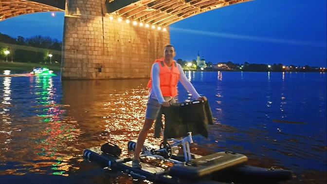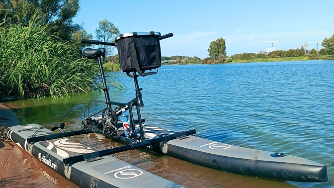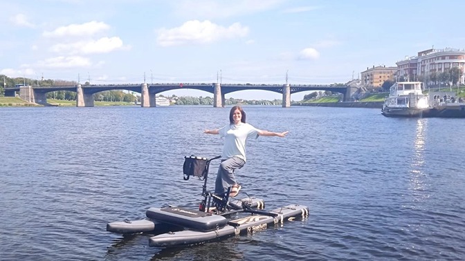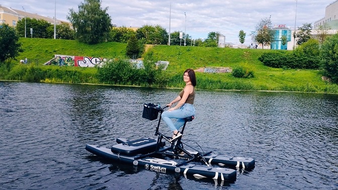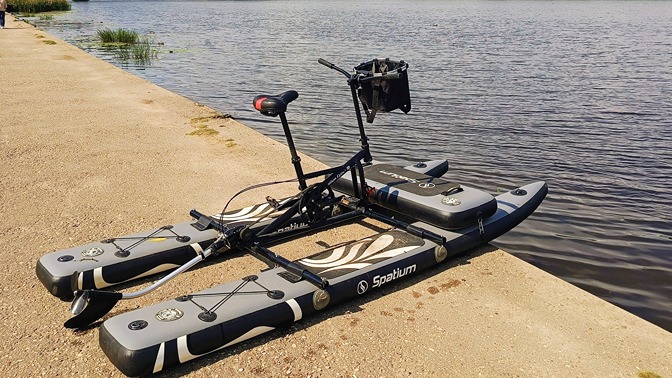 Описание водного велосипеда: устойчивая конструкция, удобное сидение, сумка для хранения в комплекте. Велосипед очень манёвренный, легкий в управлении.